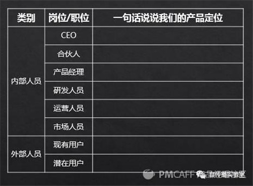 用下面這個(gè)簡(jiǎn)單的表格,問(wèn)問(wèn)包括CEO、合伙人、產(chǎn)品/研發(fā)/運(yùn)營(yíng)/市場(chǎng)等內(nèi)部工作人員以及現(xiàn)有用戶、潛在用戶,讓他們一句話說(shuō)說(shuō)我們的產(chǎn)品是做什么的。