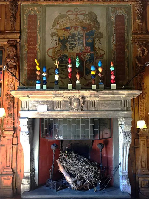 英國室內(nèi)設(shè)計(jì)師 Ashley Hicks 手工制作的桌面圖騰裝飾被擺設(shè)在巨大的壁爐上。