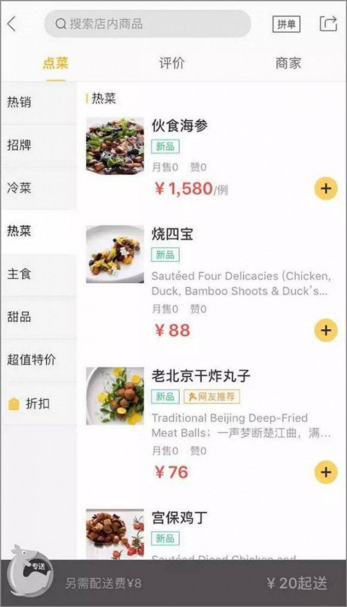 大董會(huì)做什么樣的外賣(mài)呢?我這樣想著,點(diǎn)開(kāi)了商家頁(yè)面,之后點(diǎn)進(jìn)熱菜區(qū)域: