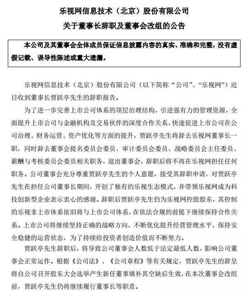 賈躍亭退出了在樂視網(wǎng)的任職,孫宏斌則將進(jìn)入董事會。