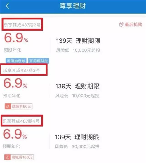 樂視金融APP上在售的樂享其成系列產(chǎn)品顯示,其中487期2號、3號和4號產(chǎn)品的投資期限完全相同,收益率也同為6.9%,并且都是7月7日起計(jì)算利息,只是2號和3號產(chǎn)品的理財(cái)起點(diǎn)起1萬元,4號產(chǎn)品的理財(cái)起點(diǎn)為3萬元。