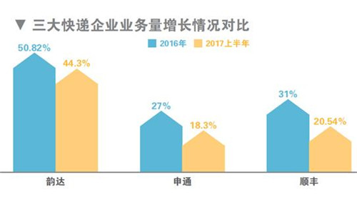 根據(jù)順豐發(fā)布的財(cái)報(bào)顯示,2017年上半年,順豐控股實(shí)現(xiàn)快件業(yè)務(wù)量13.73億件,同比增長20.54%;2016年順豐快件業(yè)務(wù)量為25.8億件,同比增長31%。而申通快遞2017年半年業(yè)務(wù)量為17.26億件,同比增長18.3%;2016年業(yè)務(wù)量近32.6億件,同比增長約27%。此外,韻達(dá)2017年上半年財(cái)報(bào)數(shù)據(jù)也顯示,業(yè)務(wù)量同比增長44.28%;相比2016年公司業(yè)務(wù)量50.82%的增幅有所減緩。