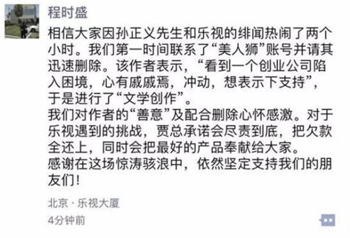 程時盛在朋友圈中寫到:相信大家因孫正義先生和樂視的緋聞熱鬧了兩個小時。我們第一時間聯(lián)系了“美人獅”賬號并請其迅速刪除。該作者表示,“看到一個創(chuàng)業(yè)公司陷入困境,心有戚戚焉,沖動,想表示下支持”,于是進行了“文學創(chuàng)作”。我們對作者的“善意”及配合刪除心懷感激。對于樂視遇到的挑戰(zhàn),賈總承諾會盡責到底,把欠款全還上,同時會把最好的產品奉獻給大家。感謝在這場驚濤駭浪中,依然堅定支持我們的朋友們!