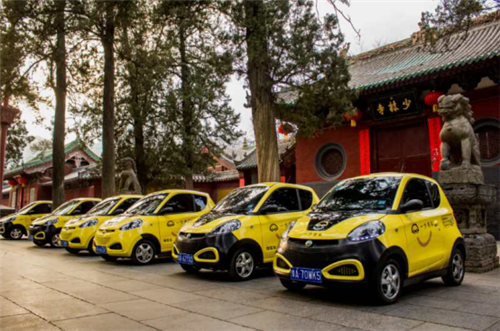 在少林寺門口,偶遇排列整齊的“一步用車”,可以在智能手機(jī)上租用的小電動(dòng)汽車。