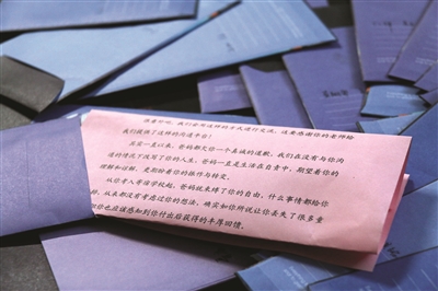 而最棘手則是一些父母與孩子之間有一些矛盾,“我們班一個(gè)男生因?yàn)楦咧袝r(shí)候爸媽管他管得太緊,以至于跟他們之間產(chǎn)生了很大的矛盾,他的父母知道有這樣一個(gè)可以給孩子寫信的機(jī)會(huì)之后,雖然很高興,但是也憂心忡忡,害怕孩子不愿意看他們的信,或者會(huì)因?yàn)檫@封信措辭不合適而加深對(duì)他們的誤解。我開導(dǎo)了他們很久,他們才愿意寫一封信,希望可以解開這個(gè)心結(jié)。”陳老師表示,這位同學(xué)的父母寫的信更像是一封和解信,在字里行間的深深愧疚中,她也感受到了家長(zhǎng)對(duì)于孩子的無(wú)奈和那一顆期望孩子快樂(lè)的心。