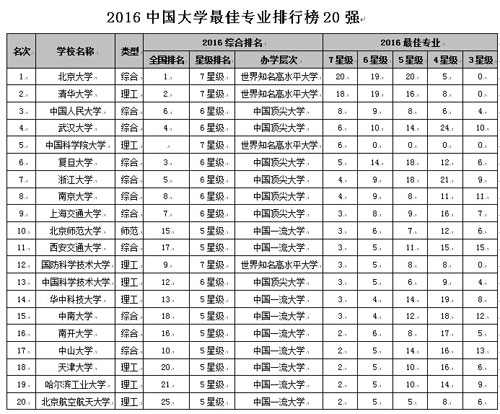 報告顯示,北京大學20個專業(yè)榮膺中國七星級專業(yè),居2016中國大學最佳專業(yè)排行榜榜首;清華大學第2,中國人民大學第3,武漢大學第4,中國科學院大學第5。