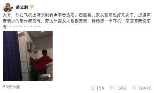3月7日晚,岳云鵬通過(guò)微博譴責(zé)飛機(jī)上不文明現(xiàn)象,寫(xiě)道:“大哥,你在飛機(jī)上聽(tīng)京劇有點(diǎn)不合適吧。后面嬰兒家長(zhǎng)跟您說(shuō)好幾次了,您連聲音調(diào)小的動(dòng)作都沒(méi)有,旁邊外國(guó)友人也很無(wú)奈,我給您一個(gè)耳機(jī),您回答我說(shuō)您有……”