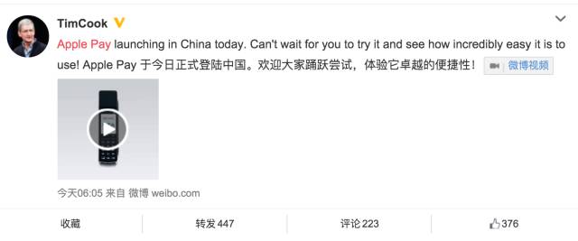 今天早上6點(diǎn)05分,蘋果ceo timcook發(fā)了一條微博宣告Apple Pay正式入華!