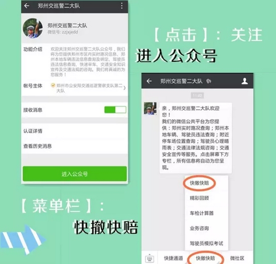 支隊科研所此次研發(fā)的交通事故快賠快撤功能,跳出了以往單方損失2000元以下的限制,只要在交警二大隊轄區(qū):嵩山路(含)嵩山路以西區(qū)域及中原區(qū)、西開發(fā)區(qū)全境,公共道路上發(fā)生的兩車事故,車輛能夠正常駕駛,沒有人員受傷,就可以通過“鄭州交巡警二大隊微信公共平臺”進行快撤快賠處理。