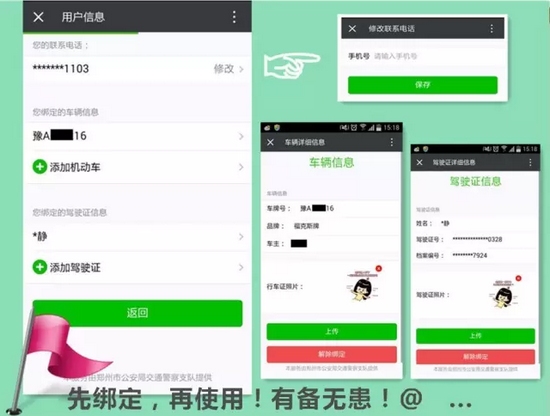 分別填寫:聯(lián)系電話、綁定車輛信息、綁定駕駛證信息確認無誤后按確定保存。