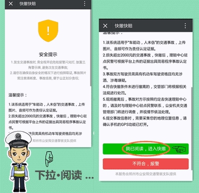 4、適用范圍:交警二大隊轄區(qū)內(nèi)嵩山路(含)嵩山路以西區(qū)域及中原區(qū)、西開發(fā)區(qū)全境,公共道路上發(fā)生的兩車事故,車輛能夠正常駕駛,沒有人員受傷,均適用。