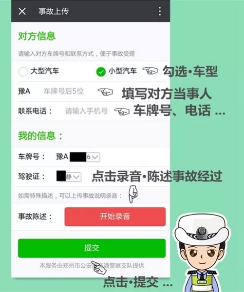填寫“事故描述”相關(guān)內(nèi)容,輸入對方車號和聯(lián)系方式。并在事故陳述處點擊“開始錄音”,描述事故發(fā)生詳細地點和成因后提交。