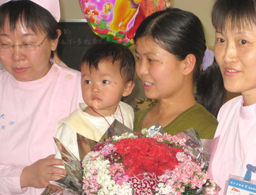 河南省婦幼保健院的醫(yī)護人員歡送康復(fù)王然出院