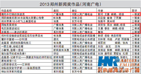 首屆“鄭州新聞獎”在北京評審,評委會對參評作品進行了認真細致的評議,經(jīng)過初評、定評共評出特等獎3篇、一等獎14篇、二等獎30篇、三等獎42篇。頒獎會對獲獎者頒發(fā)了證書和獎杯,并給予一等獎5000元、二等獎3000元、三等獎2000元的獎勵。河南人民廣播電臺報送的作品以新聞性強、主題重大、思想深刻、制作精良、廣播特色突出而獲評委好評。其中河南電臺信息廣播郭珂、王昊采寫的消息《寒風中忙碌的快遞員》,通過對鄭州市一名普通快遞員劉師傅的跟隨式采訪,將他真實的工作狀態(tài)和內心世界一一展現(xiàn),生動、感人,獲得了一等獎;《網(wǎng)格員吳明華》、《毛莊蔬菜進城記》、《走基層——身邊的感動》 3 件作品獲得二等獎;《走基層 探訪地鐵盾構施工》等5件作品獲得三等獎。河南電臺信息廣播記者郭珂作為獲獎記者代表在頒獎會上發(fā)了言,表示要按照河南臺的要求和安排,進一步轉變作風,寫出面貌一新、聽眾喜聞樂見、無愧于偉大時代的作品來。