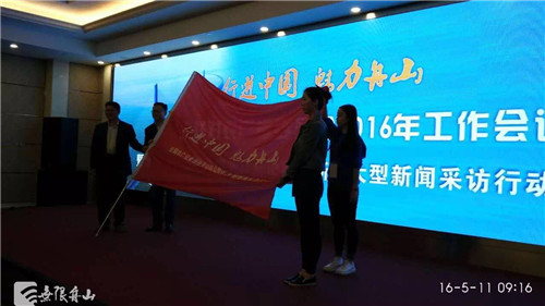 中廣聯對農廣播委員會會長史敏、舟山市委常委、宣傳部部長、統(tǒng)戰(zhàn)部部長忻海平為“行進中國 魅力舟山”全國農村廣播記者走進舟山大型新聞采訪行動授旗。中央人民廣播電臺記者劉旻嚖、舟山新聞廣播記者沈宇曄接旗。