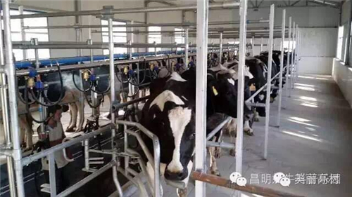 產(chǎn)奶期的奶牛從自己的牛舍成群結(jié)隊(duì)的有序步入擠奶廳,進(jìn)入擠奶廳后,每只奶牛都要先洗澡,然后人工擠掉前三把牛奶,裝好擠奶器,牛奶就從奶牛的體內(nèi)經(jīng)管道直接進(jìn)入冷藏罐了。我們可以站在觀景平臺(tái)上,透過(guò)高清玻璃,可以清楚的看到擠奶廳內(nèi)奶牛排隊(duì)擠奶的壯觀場(chǎng)景。