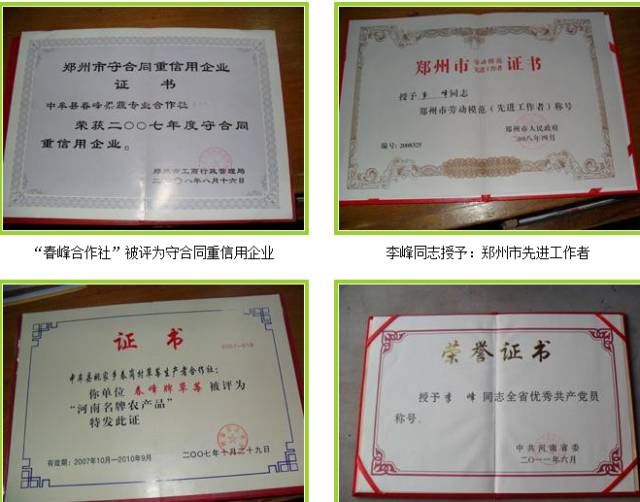 目前合作社有生產、銷售和綜合服務三個組。2006年合作社的產品獲得了無公害認證,春峰牌草莓2012年通過綠色食品基地和綠色食品認證,也是河南省首家拿到草莓綠色食品證書的品牌。