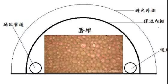 由塑料大棚外棚和內(nèi)部保溫棚組成,利用透光外棚獲取太陽能熱量為薯堆加溫,內(nèi)棚用保溫材料覆蓋,在夜間能夠保持薯堆熱量,可用通風(fēng)管道對(duì)內(nèi)棚進(jìn)行補(bǔ)充新鮮空氣與熱量交換,達(dá)到安全越冬的目的。在貯藏初期氣溫偏高,讓薯堆風(fēng)吹日曬10-15天進(jìn)行自然愈合,提高貯藏的安全系數(shù)。