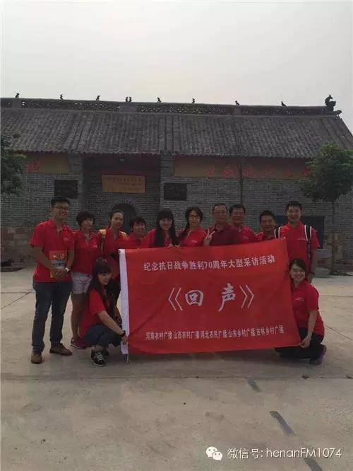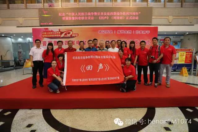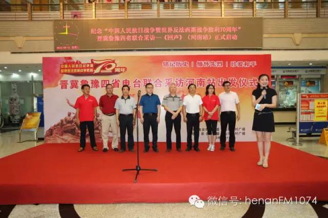 8月11日上午九點,由河南農(nóng)村廣播、山西農(nóng)村廣播、河北農(nóng)民廣播、山東鄉(xiāng)村廣播于2015年7月至9月展開“追隨先輩足跡,唱響時代凱歌”——紀念抗日戰(zhàn)爭暨世界反法西斯戰(zhàn)爭勝利70周年晉冀魯豫記者大型聯(lián)合采訪活動《回聲》在河南人民廣播電臺啟動。