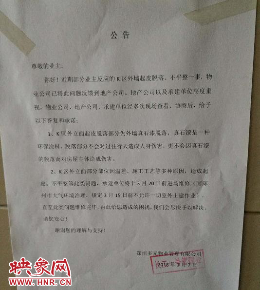 不過,發(fā)稿前,“大象幫辦”記者接到了該小區(qū)物業(yè)的最新消息:為消除業(yè)主的顧慮,他們已在小區(qū)單元門口張貼公告,向業(yè)主解釋了外立面凸起產(chǎn)生原因,并承諾承建單位工程部將組織維修人員在3月20日之前進場維修,直至此類問題維修完畢。