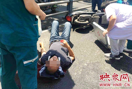 5月27日上午,鄭東新區(qū)平安大道商務(wù)外環(huán)路口附近,一年輕男子騎著電動車上班,因?yàn)闉⑺噭偨?jīng)過路面濕滑,男子不慎摔倒著地,頭部重傷造成大量出血。