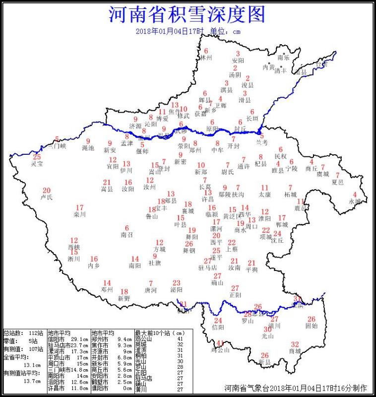 截至4日17時(shí),除東北部外,全省大部的積雪深度普遍在5厘米以上,信陽、駐馬店、南陽、漯河、平頂山、周口、三門峽、洛陽、許昌和焦作大部積雪深度在10厘米以上,信陽、駐馬店和周口南部積雪深度多在20厘米以上,最大積雪深度出現(xiàn)在雞公山41厘米(見積雪深度附圖)。