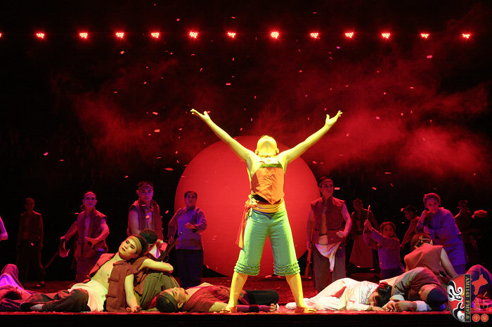 本劇以蓬蓬勃勃、充滿野性、有著旺盛生命力的紅高粱為意像,以九兒和十八刀的愛恨情仇為主線,描繪了上個世紀(jì)三、四十年代,先民們敢愛、敢恨、敢生、敢死的自由精神與生命氣度以及他們對入侵者不惜用鮮血和生命抗?fàn)帯⒖筛杩善直瘔褢K烈的過程。最后九兒用高粱酒做炸藥,引爆了日本人的軍火車,軍火車的爆炸又扎爆了熟透了的高粱米,滿天都飄灑著絢麗的高粱花——這是他們的鮮血之花、靈魂之葩,更是他們精神的升華。