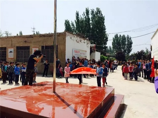 少先隊(duì)員向參加捐贈(zèng)儀式的愛心代表人士敬獻(xiàn)紅領(lǐng)巾,并獻(xiàn)上孩子們花費(fèi)一下午時(shí)間親自采摘的鮮花,并舉行升國(guó)旗儀式。