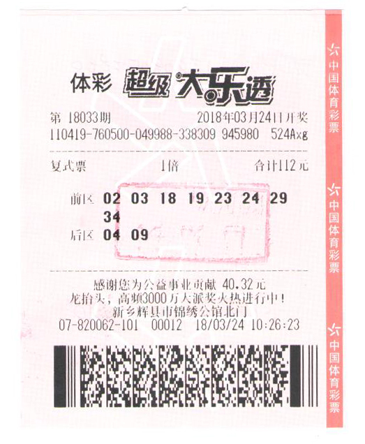 [摘要] 3月24日晚,大樂透第2018033期開獎(jiǎng),全國共中出9注頭獎(jiǎng),其中,河南彩民郝先生以一張“8+2”復(fù)式票擒獲大樂透一等獎(jiǎng)1注