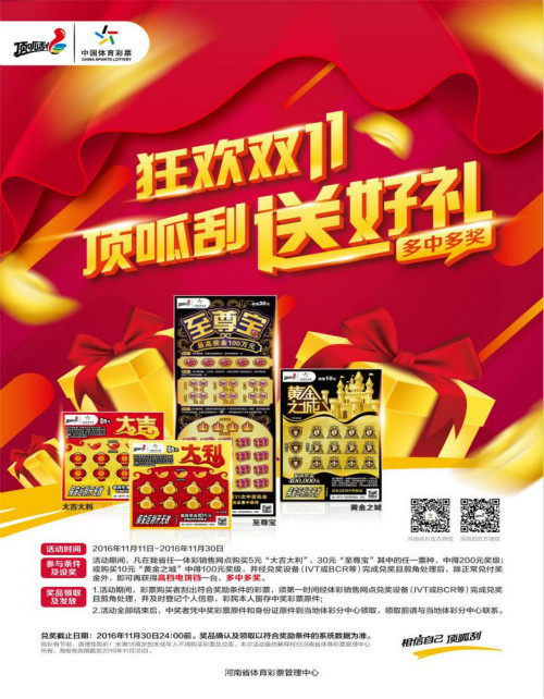 激情綻放十一月,愉悅驚喜帶回家!給力鉅惠超劃算,盡在體彩“頂呱刮”!活動詳情請咨詢全省各體彩銷售網點。