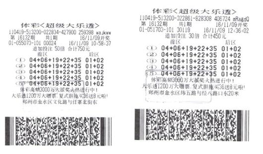 彩民在鄭州東區(qū)體彩分中心兌獎的兩張彩票--- 60倍