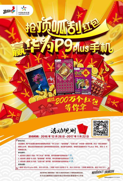 值此新年來臨之際,體彩頂呱刮為回饋彩民朋友一年來的支持,以及對體彩頂呱刮的關(guān)注,在新年期間開展“搶頂呱刮紅包,中華為P9plus手機(jī)”活動。