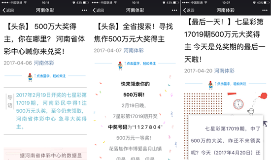 大獎(jiǎng)中出之后,中獎(jiǎng)人一直沒有到河南省體彩中心兌獎(jiǎng),而60天的兌獎(jiǎng)有效期卻在一天一天流逝,眼看2017年4月20日的最后兌獎(jiǎng)期限將至,為了更好的保護(hù)彩民利益,省體彩中心自2017年4月6日開始,通過省市網(wǎng)絡(luò)、報(bào)紙、廣播、官微、體彩銷售網(wǎng)點(diǎn)廣播消息和尋人啟事等多種形式發(fā)布消息,努力尋找和提醒中獎(jiǎng)得主。