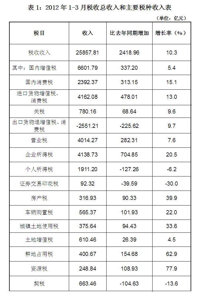 昨天財政部公布“2012年一季度稅收收入情況分析”,透露2012年1-3月全國稅收總收入完成25857.81億元,比去年同期增加2418.96億元,增長10.3%,增速大降(去年同期增速為32.4%)。