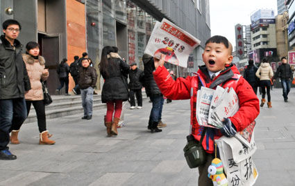 元旦小長(zhǎng)假第二天,寒風(fēng)凜冽,氣溫降到-5℃。南京新街口地鐵口川流不息的人流中,一個(gè)身穿紅色外套,背著青奧吉祥物“砳砳”的小男孩格外引人注目。他背著一只碩大口袋,報(bào)袋上印有“賣(mài)一份報(bào)紙捐一毛錢(qián)”字樣,一邊走一邊叫,“賣(mài)報(bào),賣(mài)報(bào)——”他就是去年大年夜一祼成名的裸跑弟多多,這是他的鷹爸在對(duì)他進(jìn)行財(cái)商訓(xùn)練。據(jù)悉,這是鷹式教育“十商并舉”中的重要一環(huán)。