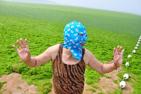 2013年7月3日,山東青島青島高溫來襲,“青島大媽”不懼滸苔,戴著“強(qiáng)盜面具”出現(xiàn)在海水浴場消暑降