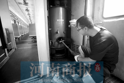 7月28日,新鄉(xiāng)最高氣溫36℃。下午1點(diǎn)30分,河南商報(bào)記者進(jìn)入車廂,車廂內(nèi)溫度計(jì)顯示44℃。這個(gè)時(shí)候,供水員李波和王旭陽,已經(jīng)在車上工作了1個(gè)多小時(shí)。當(dāng)河南商報(bào)記者走近茶爐時(shí),甚至能感覺到毛孔在一瞬間“炸開”。作為上車最早的茶爐工,他們中午12點(diǎn)就要上車,找劈柴、點(diǎn)火、燒水,將每個(gè)硬座車廂的保溫桶和全車66個(gè)暖瓶灌滿。2014年綠皮車相繼淘汰,自此再沒專人提供用于燃煤茶爐點(diǎn)火的劈柴,全靠供水工自己找尋。