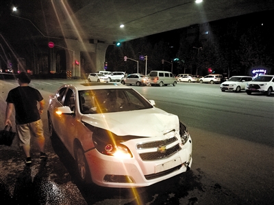 當日凌晨1時10分,記者現(xiàn)場看到,南三環(huán)南半幅下橋口處,由西向東約30米的路面上布滿車身碎片,一輛白色雪佛蘭轎車停靠在最右側(cè)快車道上,車前臉已凸起,主副駕駛室的安全氣囊均已彈出,車輛仍處于啟動狀態(tài)。