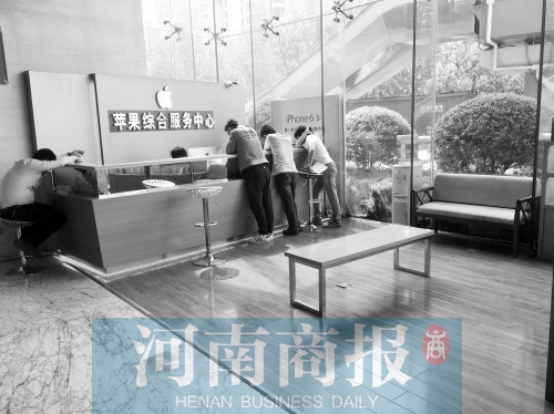 昨天上午,河南商報記者來到了升龍大廈一樓。該手機維修點有多處“蘋果”的標志,柜臺里也全是蘋果手機以及相關(guān)配套產(chǎn)品,有兩個消費者在維修蘋果手機。