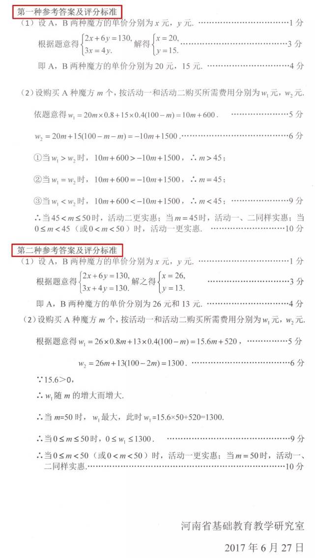 該題不存在科學(xué)性錯(cuò)誤,但在文字表述上不夠精準(zhǔn),致使部分考生產(chǎn)生不同理解。按照題目給定的條件,可以有兩種解法。除《二0一七年河南省普通高中招生考試試卷、參考答案及評分標(biāo)準(zhǔn)》給定的解法和答案外,還有另外一種解法和答案。兩種解法都能考查出同樣的數(shù)學(xué)思維和方法,且難度相當(dāng)。