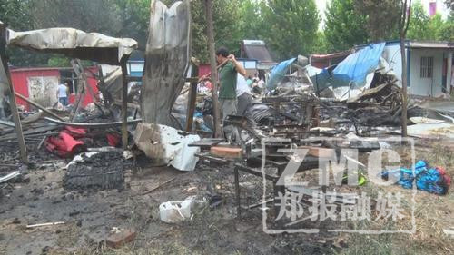 現(xiàn)場村民介紹,火災(zāi)發(fā)生時(shí)附近有人正在做滿月酒,屋頂電線突然“噼啪”作響,火星濺下引燃了安置區(qū)的簡易房,失火房屋內(nèi)放置有生產(chǎn)包的設(shè)備和成捆的布匹。