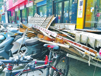 本報訊8月5日下午1時40分左右,鄭州市民李女士逛過大學路一家沿街服裝店,轉(zhuǎn)身剛剛離去,只聽見轟的一聲巨響,店鋪的門頭招牌墜落。約20平方米的門頭招牌,砸中了店前幾輛電動車,幸未殃及行人。
