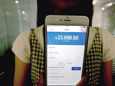 1995年出生的小涂來自浙江省溫州市,他掏出手機點擊“百度有錢花”軟件,屏幕上顯示“待還款金額為18644”“第5期還款142.20元”,女孩小梅的手機屏幕上應還款金額則是23898.60元,第二期應還款為178.20元。
