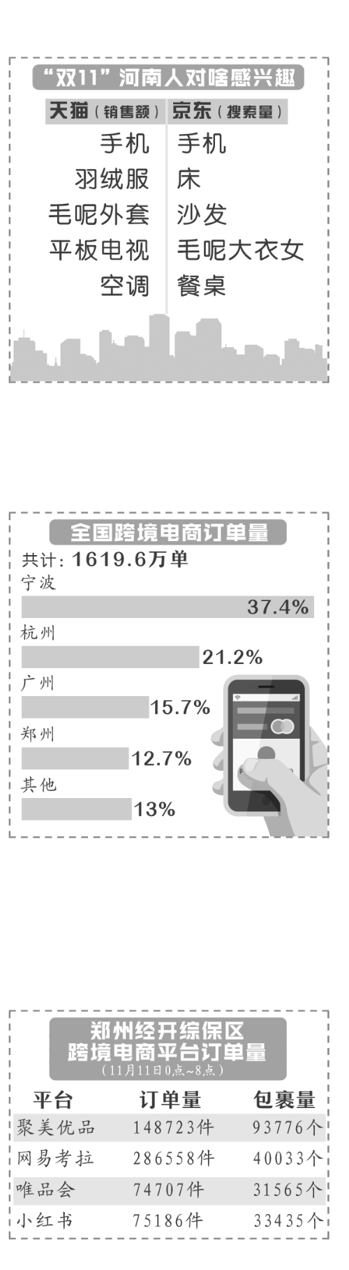 除了“剁手”族,鄭州的跨境電商平臺在這場狂歡中的表現(xiàn)也十分搶眼。11月12日,河南商報記者從河南出入境檢驗檢疫局獲悉,海關總署統(tǒng)計數(shù)據(jù)顯示,僅11月11日,全國跨境單量共計1619.6萬單,其中,鄭州占比12.7%。
