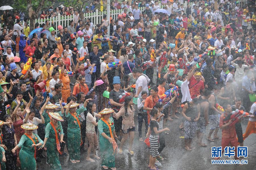4月12日,人們在德宏芒市廣場上體驗(yàn)潑水狂歡。當(dāng)日,云南省德宏傣族景頗族自治州繼續(xù)舉行2013年國際潑水狂歡節(jié),各族群眾和游客歡聚在德宏芒市廣場狂歡潑水,祈福吉祥平安。 新華社記者秦朗 攝