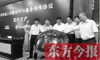 省委副書記、省長謝伏瞻發(fā)來賀信,向河南IPTV業(yè)務(wù)三方合作協(xié)議成功簽署表示熱烈祝賀。副省長張廣智,省委宣傳部副部長、省廣電局局長趙景春,省委宣傳部副部長、河南日?qǐng)?bào)報(bào)業(yè)集團(tuán)董事長、社長朱夏炎,省工信廳廳長王照平,省通信管理局局長宋靈恩,中國網(wǎng)絡(luò)電視臺(tái)總經(jīng)理、愛上電視傳媒有限公司董事長汪文斌,河南電視臺(tái)臺(tái)長王少春共同出席了簽約儀式,宣告河南IPTV業(yè)務(wù)正式啟動(dòng)。