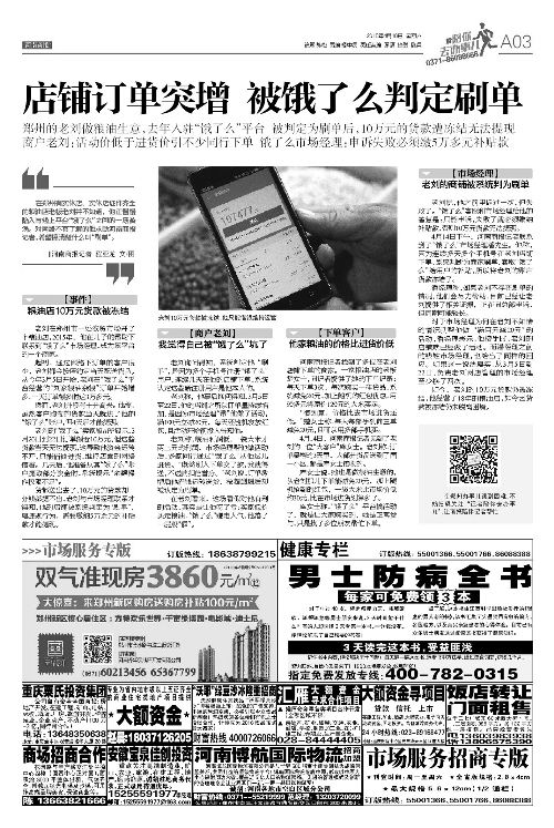 4月16日,《河南商報(bào)》以《店鋪訂單突增 被餓了么判定刷單》為題,對(duì)老劉10萬(wàn)多元的交易款被凍結(jié)一事進(jìn)行報(bào)道,“餓了么”市場(chǎng)經(jīng)理潘先生稱(chēng),因?yàn)檫B續(xù)多天多個(gè)手機(jī)號(hào)在老劉店鋪下單,系統(tǒng)判斷為商家刷單,套取“餓了么”給用戶的補(bǔ)貼,所以將老劉的賬戶貨款凍結(jié)了。