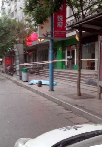 剛跑幾步,就聽到“咚”的一聲響了,回頭一看,一名男子掉在垃圾桶旁的人行道上,只穿了一條黑色內(nèi)褲,滿身是血,“從沒見過(guò)這樣的場(chǎng)面,我嚇住了,身上沒有電話,只能喊人”。