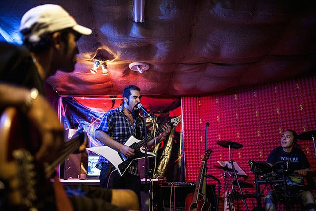 盡管照片中的人顯得很輕松,但對拍攝照片的Fatemi來說卻十分不易。這個攝影師花了數(shù)月才被允許進(jìn)入女性健身房、發(fā)廊等。很多人不愿意被拍到臉,怕被認(rèn)出來;很多人取消了預(yù)約,怕因此丟了工作。雖然存在著種種困難,F(xiàn)atemi還是取得了驚人的成果,為伊朗和外界拍攝了包羅萬象的精美照片。圖為私人搖滾音樂會。搖滾音樂在這里是被禁止的,所以這類表演一般都很隱秘的。
