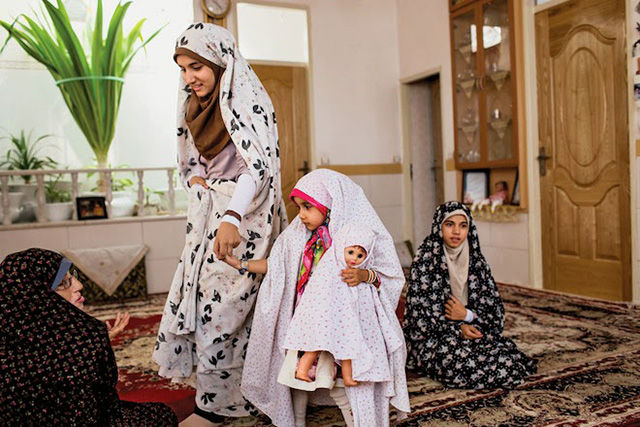 伊朗亞茲德中某家庭的女性成員,最小的女孩抱著一個娃娃,娃娃也帶著頭巾